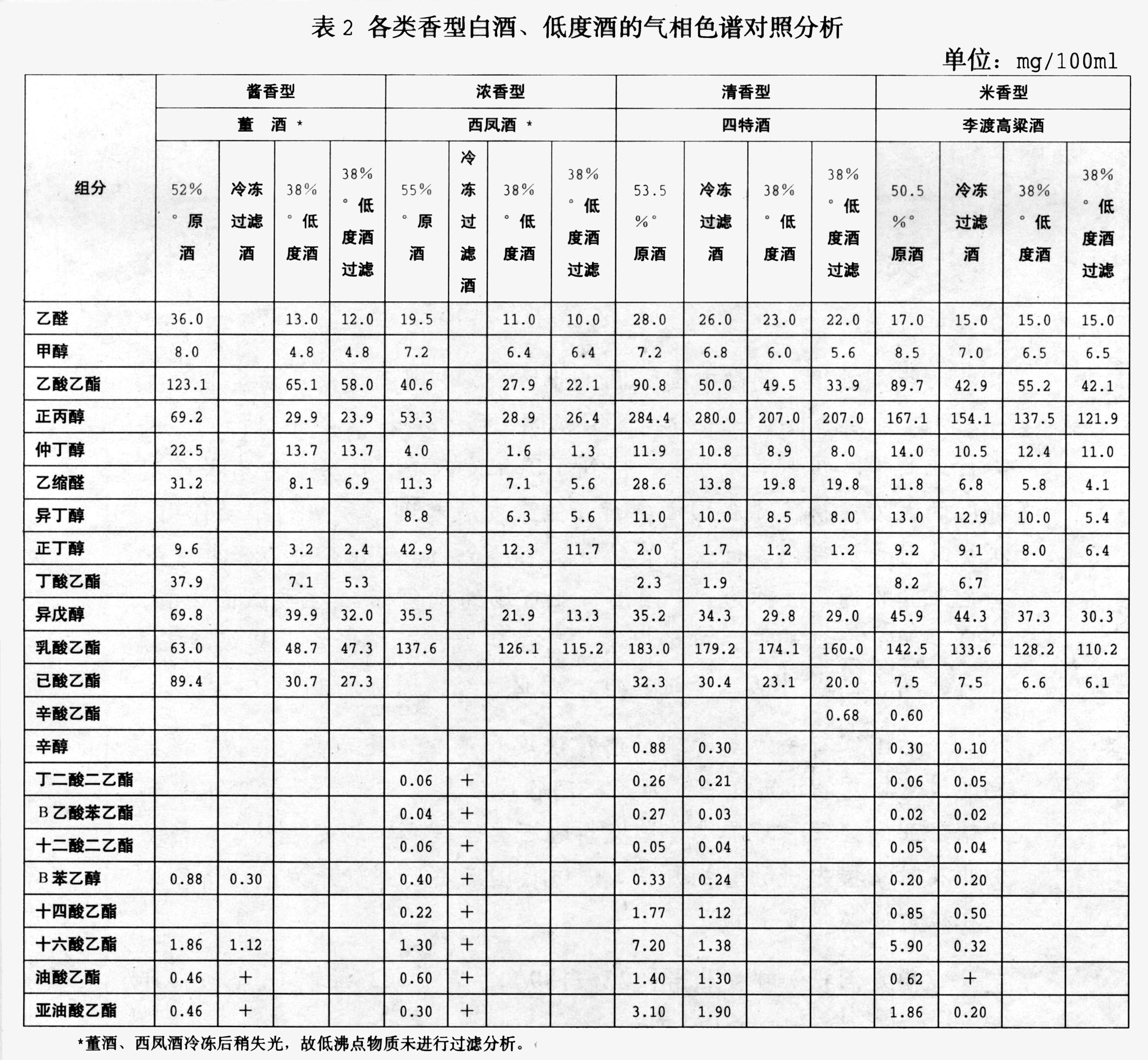 一般認為,冷凍法對白酒原有的風格保持比較好,但設備投資大,生產時能耗高。(見表1、表2)