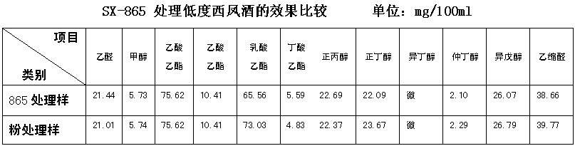 SX-865是硅酸鹽粘土經理化處理后加入適量助劑,按配方制備而成。主要成分為硅和鎂。它所持有的三維立體鏈結構使它具有較強的吸附性。試驗將西鳳酒(38%vol~39%vol)添0.01%~0.02%的SX-856,攪拌均勻放置12~24小時,酒液澄清后過濾的低度酒,在-5℃貯存可保持清涼透明。