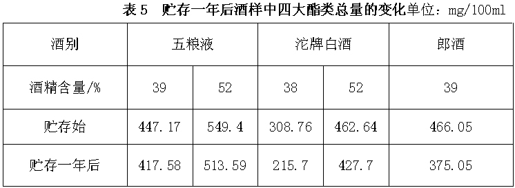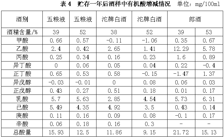 酸類和脂類的變化為:有機酸含量一般均隨貯存時間的延長而增加。其中,低度酒的總酸量比高度酒增幅更大。在濃香型酒中,乳酸、己酸和乙酸為多;在醬香型酒中,乙酸、乳酸、丙酸為多。與此相對應的乙酯類,隨著貯存時間的增長而呈減少趨勢,其中,己酸乙酯、乳酸乙酯變化最大,高沸點脂類變化微弱。顯示了白酒貯存中含量多的低沸點脂類水解作用強烈。測定結果見表4、表5。