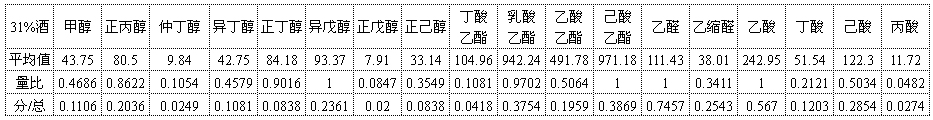 31%voL扳倒井酒低度白酒色譜骨架成分見下表(單位:mg/l)。