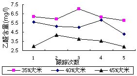 從圖2可看出:大米比例由35%提高至45%,麥汁中可發酵性糖等組分改善,乙醛含量約下降40%,即提高輔料大米比例可獲得乙醛含量較低的成品酒。