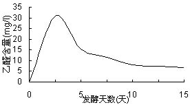 乙醛含量隨發酵進行快速增長,又隨著啤酒的成熟而逐漸減少,其變化類似于雙乙酰。乙醛在主發酵前期大量形成,一般在麥汁滿罐后2~3天,即下面發酵至發酵度為35~60%時,達到峰值20~40mg/l,在升壓后的2天左右很快下降,降溫至后發酵期間乙醛含量變化趨緩,發酵14天左右至貯酒期其含量變化很小。圖1為我們跟蹤的一罐發酵液乙醛含量變化趨勢圖。