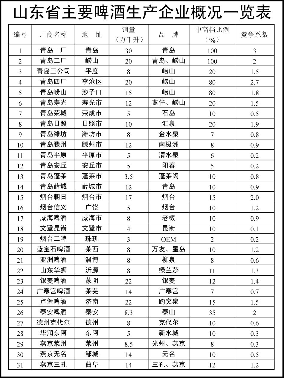在啤酒行業的微利時代,面對惡性競爭、面對價格戰、面對逐漸被啤酒巨頭瓜分的區域市場,中小型啤酒企業可謂是舉步維艱。然而,對于那些啤酒巨頭在各地組建的區域啤酒企業來說,他們也絕非無懈可擊。從山東省的啤酒市場來看,匯集了青島、嶗山、燕京、雪花、煙啤等眾多品牌,有些區域的市場競爭異常激烈。故此,大部分企業采用低價競爭策略來完成市場運作,山東省所有啤酒生產企業的情況如圖表所示(見下面表格):