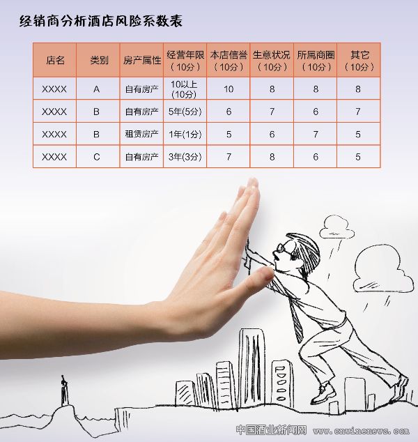 針對月結(jié)和壓批的每家酒店建立檔案,檔案內(nèi)容除了客戶名稱、地址、送貨方式、結(jié)算方式等基本信息外,主要是風(fēng)險預(yù)警信息和內(nèi)容。明晰一是該酒店經(jīng)營場所是自有房產(chǎn)還是租賃房產(chǎn);二是該酒店以往的信用情況,了解該酒店結(jié)款的及時程度和結(jié)款額的多少;三是該酒店的經(jīng)營情況,也就是生意的好壞,了解是經(jīng)營多年的老店、還是新開張不到半年的新店,還是其它情況;四是酒店所處的商圈,屬于舊城改造區(qū)或是道路改造區(qū),還是政商務(wù)區(qū)、工業(yè)園區(qū)等。然后,將上述指標(biāo)賦以分值,分值越高風(fēng)險系數(shù)越低,分值越低風(fēng)險系數(shù)越高。