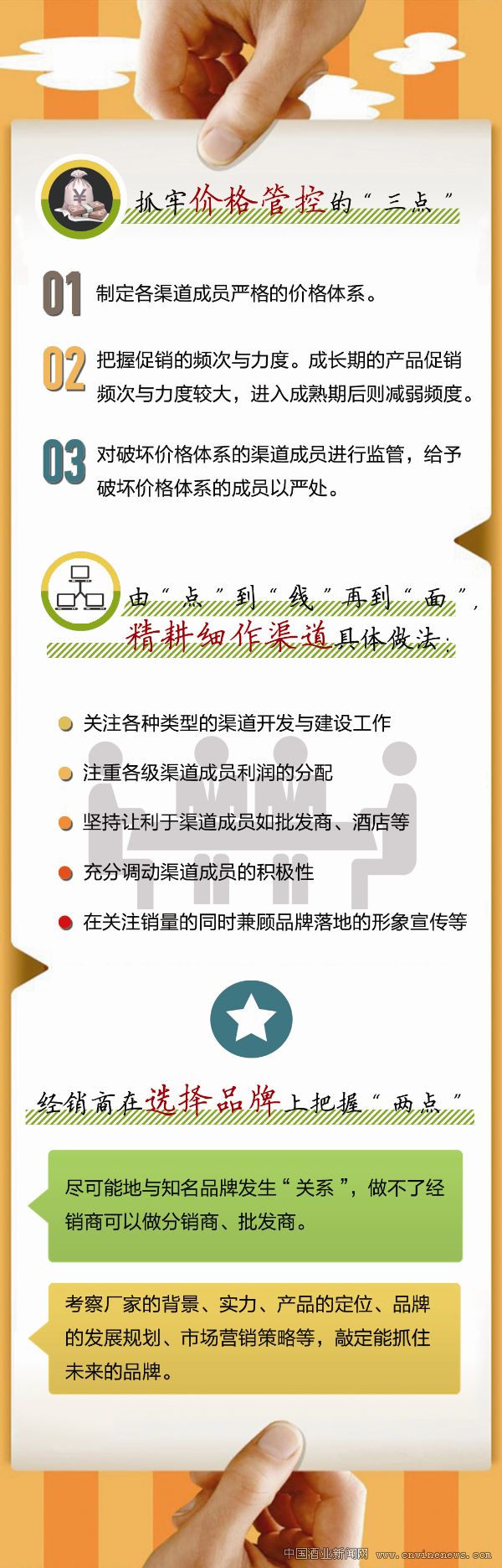 現在的市場競爭越來越激烈,經銷商要想在激烈的市場競爭中做大做強,必須在渠道上實行精耕細作的渠道策略,要注重終端的長期建設、構建可持續發展的渠道盈利模式,追求牢固的市場基礎打造與品牌影響力的長期營造,逐步將市場網絡由“點”到“線”再到“面”。具體做法表現為:關注各種類型的渠道開發與建設工作、注重各級渠道成員利潤的分配,堅持讓利于渠道成員如批發商、酒店等,充分調動渠道成員的積極性;在關注銷量的同時兼顧品牌落地的形象宣傳等等。