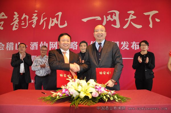 會稽山總經理傅祖康與酒仙網董事長郝鴻峰共同簽署合作協議。