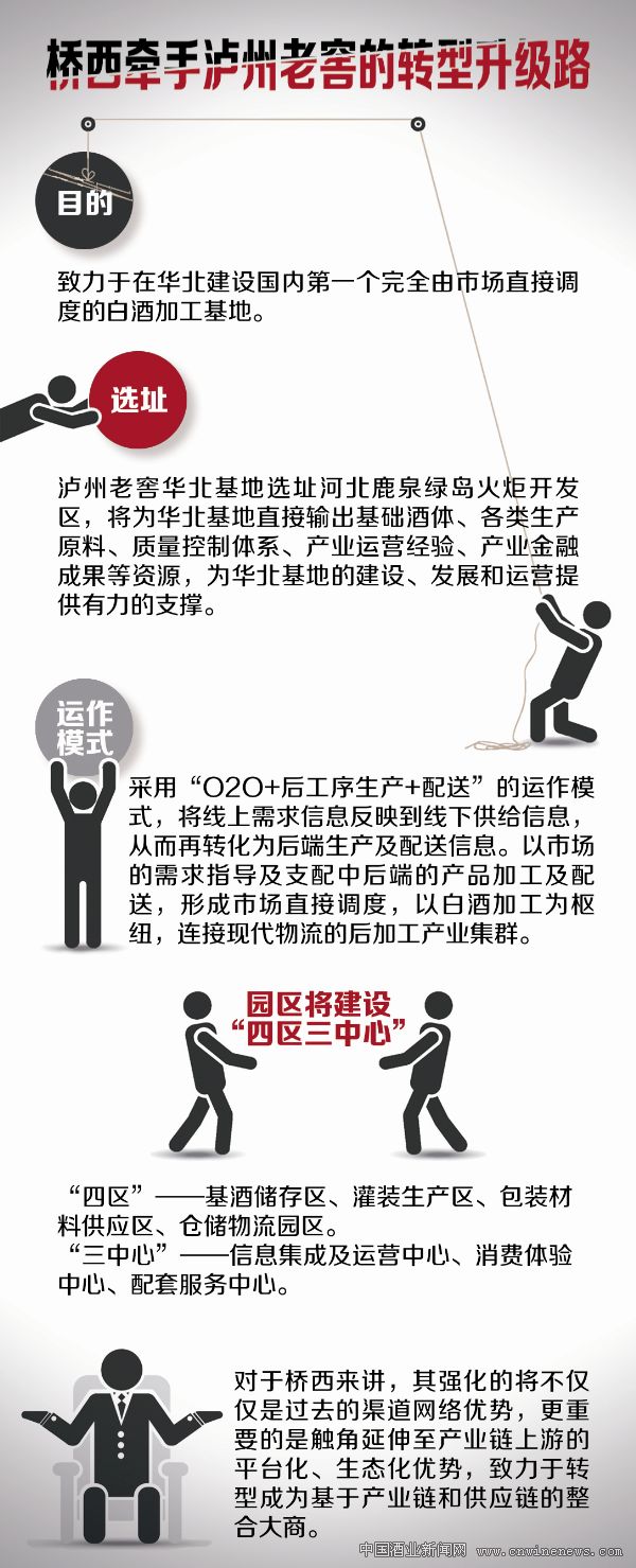 不過,雙方并沒有滿足于這一層面的合作。基于瀘州老窖多年來在商業(yè)模式方面創(chuàng)新的探索以及橋西在全國各地,特別是華北地區(qū)的渠道網(wǎng)絡(luò)建設(shè),進(jìn)一步加深合作成為順勢之舉。早先,瀘州老窖已經(jīng)在西南成功打造了中國白酒金三角酒業(yè)集中發(fā)展區(qū),園區(qū)入駐產(chǎn)業(yè)鏈企業(yè)逾100家。此次雙方的合作,致力于在華北建設(shè)國內(nèi)第一個由市場直接調(diào)度的白酒加工基地。