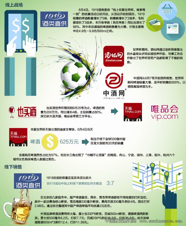 與時間賽跑的線上戰(zhàn)場 6月13日,2014年巴西世界杯正式開幕,但是早在6月4日時,1919酒類直供(以下簡稱1919)線上“歡聚世界杯,暢享每一刻”的優(yōu)惠活動就已經(jīng)開啟了。
