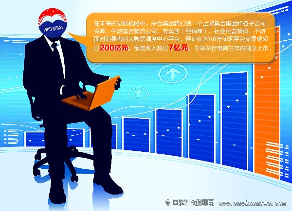 根據茅臺方面的說法,在未來的發展戰略中,茅臺集團將打造一個上游集合集團和各子公司資源,中游集合物流公司、專賣店(經銷商)、社會化營銷員,下游面對消費者的大數據調度中心平臺,預計在2018年實現平臺交易額超過200億元,銷售收入超過7億元,力爭茅臺電商三年內獨立上市。