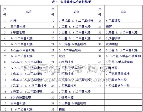 大曲中微量成分種類的多少及含量的高低,在白酒中發揮了相當重要的作用。它影響著中國白酒的質量和風格。趙東等人采用頂空固相萃取氣質聯用法測定大曲中的香味成分,發現大曲中的香味成分有吡嗪類、吡啶類、吡咯類、呋喃類、吡喃類、噻唑類高級脂肪酸類,達數十種之多(表3)。它們必然融入酒體而影響酒的質量