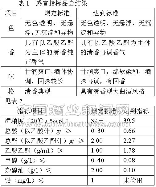 通過感官品嘗和氣相色譜分析相結合的方式,經過上百次的小樣勾調試驗,篩選出了既能突出清香風格,又照顧后味,酒體協調,并能基本解決各種質量缺陷的勾兌工藝,所勾兌出的樣品經組織專業評酒委員品嘗后一致認為,質量達到了預定的要求(見表1、表2)。