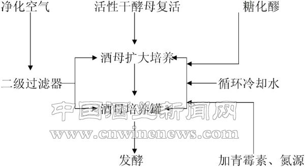 使用糖化醪,在密閉罐內接入酵母菌種,通入微量的無菌空氣,保壓培養,獲得發酵力強的純酒母醪,供酒精發酵。