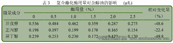 從表3可以看到,在復(fù)合酯化酶的添加量小于1%時(shí),異戊醇、正丙醇、異丁醇的量有緩慢的下降,在添加量為投糧的1%—2%時(shí),上述三者下降迅速,異戊醇從0.462g/L 下降到0.287g/L,正丙醇從0.199 g/L下降到0.165g/L,異戊醇則從0.462g/L 下降到0.287g/L, 此后再增加酯化酶的用量,雜醇類物質(zhì)產(chǎn)量只有少量的減少,當(dāng)添加量為2 .5%時(shí),相對于沒有添加復(fù)合酯化酶的對照組相比,異戊醇、正丙醇、異丁醇的量分別減少了48 .6%、22 .4% 和49 .8%,總體下降明顯。復(fù)合酯化酶中含有高產(chǎn)酸性蛋白酶的微生物,增強(qiáng)了酒醅中的蛋白酶活性,使糟醅中的氨基酸氮的量有所增加,從而避免了酮酸在酶的作用下脫羧、還原可以生成雜醇。繼續(xù)增加則會(huì)產(chǎn)生過多的氨基酸,其在酵母酶系的作用下,脫氨基、脫羧基生成比氨基酸少一個(gè)碳原子的雜醇,從而使雜醇油的減少變緩。