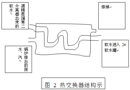 即由1#軟水罐出水的軟水先進(jìn)入酒精蒸餾第二分離器作冷水用,吸收由冷卻放出的熱量,然后再進(jìn)入交換器如圖(2)所示,軟水走熱交換器內(nèi)的細(xì)彎管,由鍋爐自身連續(xù)排污放出的含鹽量或堿度較高的廢熱鍋水或品質(zhì)變差的廢蒸汽走管外,二者通過(guò)熱交換,軟水溫度由原來(lái)的10℃上升到現(xiàn)在的60 ℃(實(shí)測(cè)),然后再進(jìn)入2#軟水罐,由泵打入鍋爐。