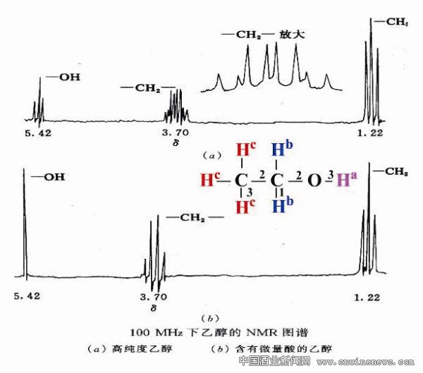 酒飲料中由于含有酸、醇、酯、醛、酮、芳香化合物等,氫鍵的結合,不僅僅是乙醇—水之間氫鍵的結合。研究表明,乙醇與水分子結合的疏密程度與酸和多酚密切大關系。向60%乙醇水溶液加入乙酸,隨著酸濃度的進一步增大,化學位移向更低磁場方向移動,促進了水與乙醇之間的質子交換,同時形成了更加井然有序的水—乙醇溶液的結構特征。