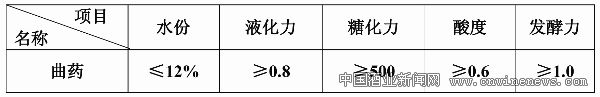選用中高溫曲為糖化發(fā)酵劑。制曲頂火溫度為60℃—62℃,其各項化驗指標(biāo)見表2。