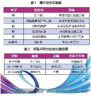取20瓶該沉淀酒樣過濾出結晶物質,將結晶分別倒入100ml水中和酒精中,得出結論是此文章來源華夏酒報沉淀物質易溶于水,而不溶于酒精,初步定性為某金屬的無機鹽類物質。做排除實驗,取10瓶酒的沉淀物加蒸餾水洗脫至500ml,分成10份分別加指示劑定性。結果見表1。