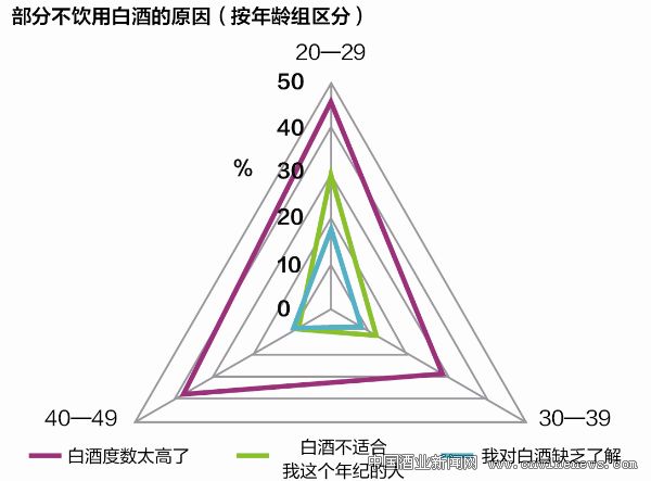 重點分析:在外國產品和文化流入的影響下,年輕人更樂于接受海外的新奇烈酒。而白酒在與此同時逐漸失去了魅力與光彩。雖然他們并不見得認為白酒“過時”,但白酒顯然已不新穎時尚了。