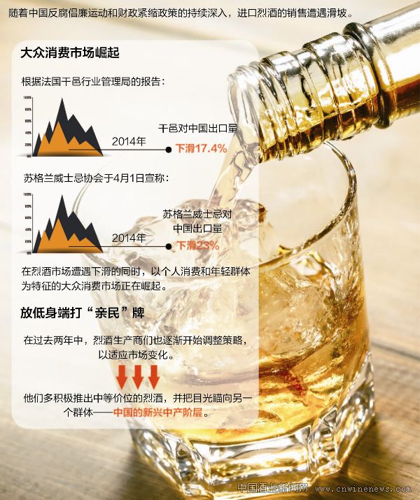 隨著中國反腐倡廉運動和財政緊縮政策的持續深入,進口烈酒的銷售遭遇滑坡。不過,國外酒商對未來的中國市場依然充滿信心,他們將目標從高端消費者轉向上世紀80年代之后出生的年輕人以及不斷擴大的新興中產階層。