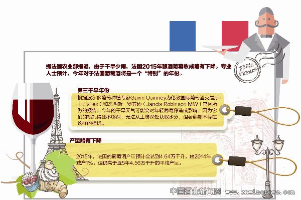法國農業部的數據與葡萄酒行業的估計結果一致,業內專家預計,2015年法國葡萄產量將在4.6萬千升左右。