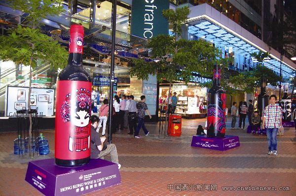 在11月3日—5日香港美酒展期間,香港主文章來源華夏酒報要商業區酒香濃郁。圖為在香港銅鑼灣,國際著名時裝設計師 Vivien Tam 設計的酒瓶藝術品。