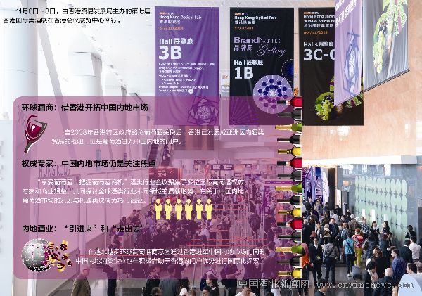 11月6日~8日,由香港貿易發展局主辦的第七屆香港國際美酒展在香港會議展覽中心舉行。本次展會匯聚了來自世界各地38個國家及地區的1007家參展商,一連三天的展覽共吸引了來自75個國家及地區約2萬名買家,以及超過3萬名社會公眾人士入場。