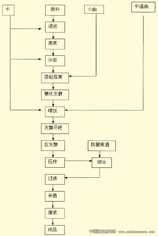 該工藝采用小曲、中溫曲做糖化發(fā)酵劑,生產(chǎn)的黃酒,口感較淡薄、余香較短。
