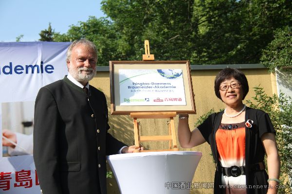 青啤公司副總裁姜宏與德國(guó)杜門(mén)斯啤酒學(xué)院校長(zhǎng)Wolfgang共同為釀酒師培訓(xùn)基地揭牌