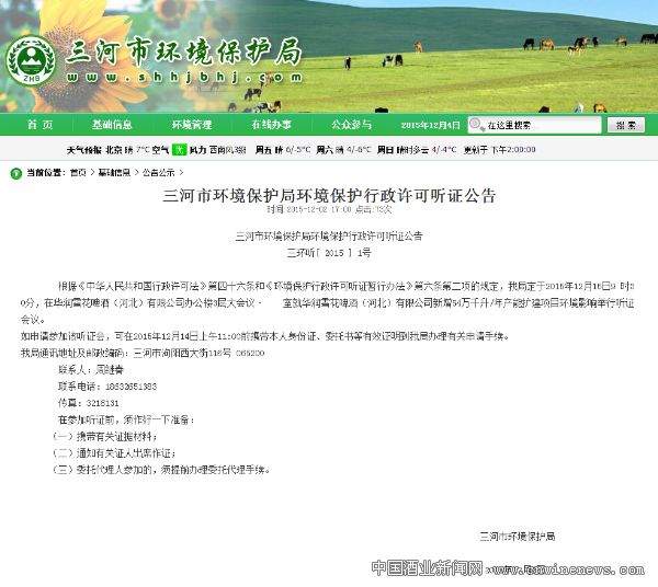 12月2日,河北省三河市環(huán)境保護(hù)局在其官方網(wǎng)站上發(fā)布公告,就華潤雪花啤酒(河北)有限公司新增54萬千升/年產(chǎn)能擴(kuò)建項(xiàng)目環(huán)境影響于2015年12月15日在華潤雪花啤酒(河北)有限公司辦公樓3層大會(huì)議舉行聽證會(huì)議。