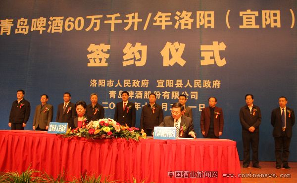 11月21日,青島啤酒60 萬千升/年洛陽(宜陽)啤酒項目順利簽約,河南省委常委、洛陽市委書記毛萬春、洛陽市委常委、常務副市長吳中陽、宜陽縣委書記王琰君、青島啤酒股份有限公司總裁黃克興、副總裁劉英弟等出席了本次簽約儀式。