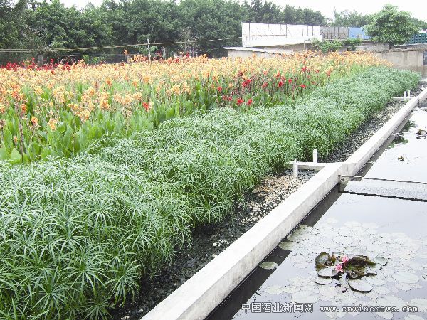 青島啤酒南寧公司的人工濕地,荷花點(diǎn)點(diǎn)浮于處理后的清水之上,鮮花與綠植形影成趣。