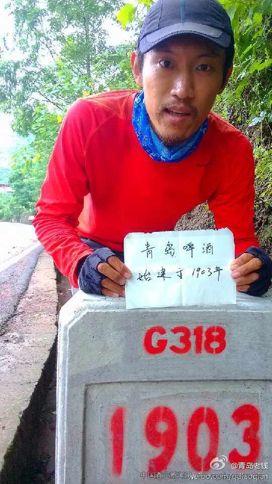 網友“青島老錢”,在上海到西藏的徒步旅行中,行至1903公里處發來的照片,紀念青島啤酒始于1903年。