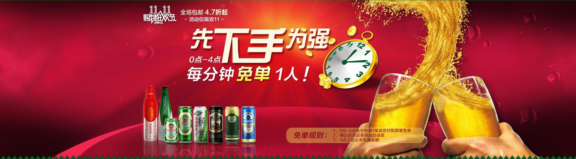 “雙十一”來了,你還在等什么?這句話喊出了曉丹和成千上萬個網(wǎng)購迷的心聲,所以她本著先下手為強的原則,對人對物。要搞一個盛大的單身狂歡派對,不醉不歸,喝酒壯膽跟丁飛告白,明年勢必告別光棍。所以這個雙十一除了搶購日常必需品,大批量的啤酒囤貨才是正事,而青島啤酒天貓旗艦店的款款雙十一活動,簡直是太合她的心意了。“11月11日9點到18點的瘋狂秒殺”,“19點到24點的第二箱半價”“50元優(yōu)惠劵”,這些在她看來都相當(dāng)?shù)恼T惑,但是當(dāng)0點—4點免單這幾個字樣映入眼簾的時候,她就決定要以資深網(wǎng)購族的身份贏得免單,然后再贏得愛情。黑啤,奧古特,純生,再來點鴻運當(dāng)頭,迅速放入購物車后,萬事俱備,只等雙十一付款時刻的到來!