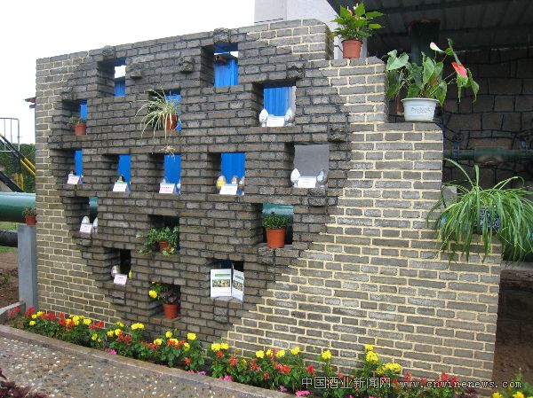 回收的硅藻土制磚搭建的環(huán)保墻上,集中展示了青 島啤酒變廢為寶的各種產(chǎn)品