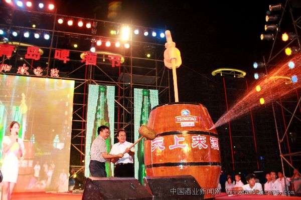 8月18日晚8點,貴陽市金陽世紀(jì)金源購物中心廣場變成一片歡樂的海洋,亞洲最大的啤酒盛會青島國際啤酒節(jié)移師貴陽華麗綻放。隨著貴州省人民政府副省長蒙啟良以及青島啤酒股份有限公司董事長金志國共同敲擊具有象征意義的“天上來酒”啤酒桶,大啤酒桶瞬間噴射的啤酒酒花四濺,首屆貴陽青島啤酒節(jié)在中國(貴州)酒類博覽會期間盛大開幕。