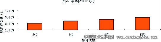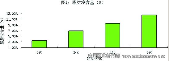 從圖2可以看出,酵母經過酸洗后,各代數酵母的脂肪粒含量呈微量下降的趨勢,并且各代酵母的含量差異也相對要小一些。