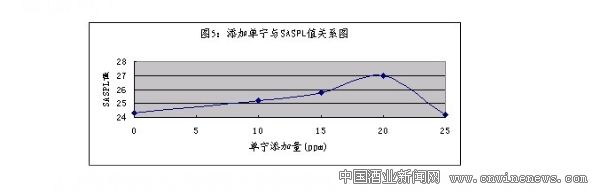 從上圖可以看出,隨著單寧R添加量的上升,SASPL值有上升的趨勢(shì),但當(dāng)達(dá)到25ppm時(shí)此值略有下降,表明單寧的用量對(duì)啤酒的穩(wěn)定性有一定的影響,并且適當(dāng)?shù)挠昧繒?huì)延長(zhǎng)啤酒的保質(zhì)期,增加啤酒的穩(wěn)定性。如果啤酒中含氧量高,使啤酒中的多酚與單寧多處于氧化態(tài),則這些氧化態(tài)的多酚或單寧,可促進(jìn)高級(jí)醇和脂肪酸的氧化,對(duì)啤酒風(fēng)味不利。