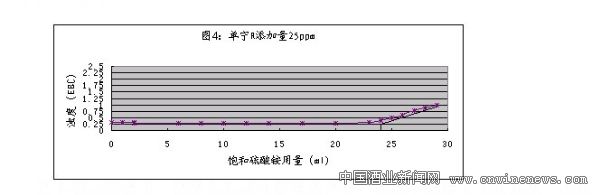 以下是單寧R添加量為25ppm時(shí)對(duì)應(yīng)滴加飽和硫酸銨與啤酒濁度的關(guān)系曲線(圖4):