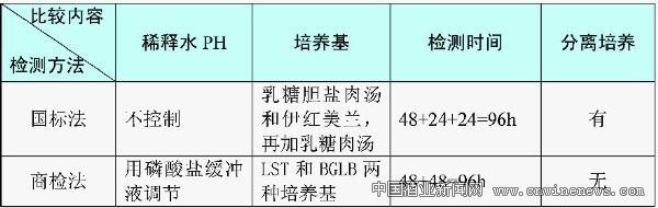 目前食品行業測定大腸菌群的方法有國標法(GB)、行標法(SN)和快速檢測法(3M)。三種方法各有特點,其中,國家標準采用三步法:1)乳糖發酵試驗:樣品稀釋后,選擇三個稀釋度,每個稀釋度接種三管乳糖膽鹽發酵管。36±1℃培養48±2h,觀察是否產氣。2)分離培養:將產氣發酵管培養物轉種于伊紅美藍瓊脂平板上,36±1℃培養18h—24h,觀察菌落形態。3)證實試驗:挑取平板上的可疑菌落,進行革蘭氏染色觀察。同時接種乳糖發酵管36±1℃培養24±2h,觀察產氣情況。報告:根據證實為大腸桿菌陽性的管數,查MPN表,報告每100ml(g)大腸菌群的MPN值;行標法采用兩步法:1)推測試驗:樣品稀釋后,選擇三個稀釋度,每個稀釋度接種三管LST肉湯。36±1℃培養48±2h,觀察是否產氣。2)證實試驗:將產氣管培養物接種煌綠乳糖膽鹽(BGLB)肉湯管中,36±1℃培養48±2h,觀察是否產氣。以BGLB產氣為陽性。查MPN表,報告每ml(g)樣品中大腸菌群的MPN值。兩種方法的比較結果見表2所示。