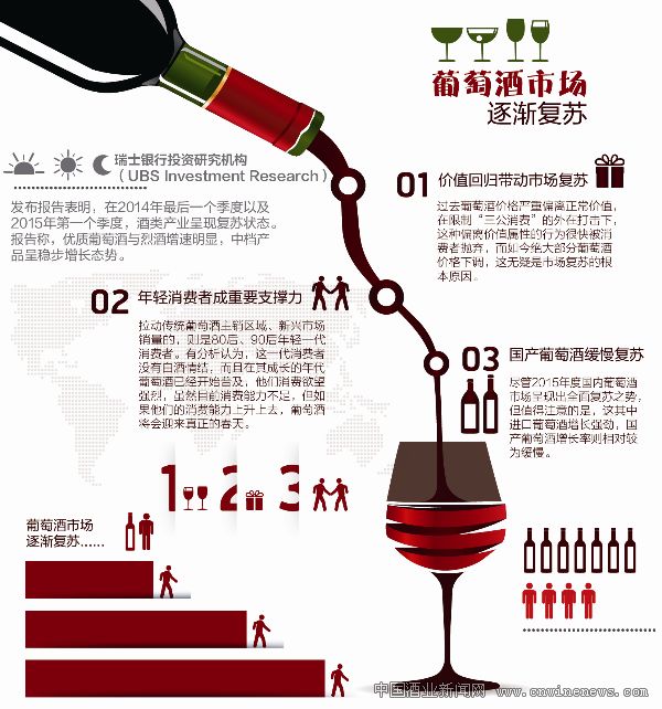 瑞士銀行投資研究機構(UBS Investment Research)發布報告表明,在2014年最后一個季度以及2015年第一個季度,酒類產業呈現復蘇狀態。報告稱,優質葡萄酒與烈酒增速明顯,中檔產品呈穩步增長。