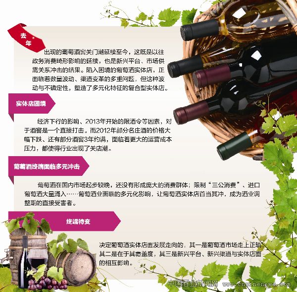 葡萄酒在國內市場起步較晚,還沒有形成龐大的消費群體;限制“三公消費”、進口葡萄酒大量涌入的沖擊以及互聯網新渠道的沖擊……葡萄酒業面臨的多元化影響,讓葡萄酒實體店首當其沖,成為酒業調整期的直接受害者。