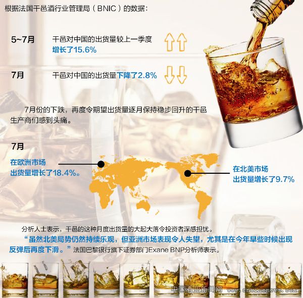 今年5~7月,干邑在歐洲和北美市場(chǎng)迅速反彈,但亞洲市場(chǎng)的不穩(wěn)定仍然持續(xù)。7月份,干邑對(duì)中國(guó)的出貨量下降了2.8%,使得年初開(kāi)始的反彈猶如曇花一現(xiàn),令干邑巨頭們?cè)俣认萑霌?dān)憂(yōu)。