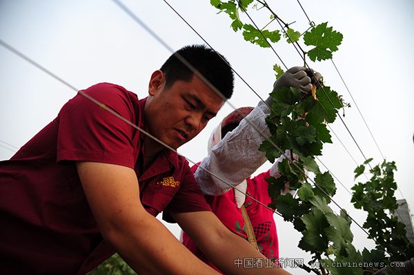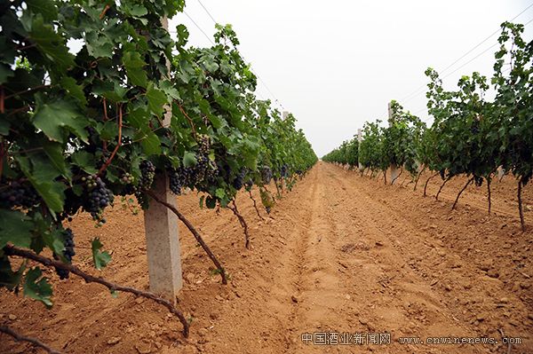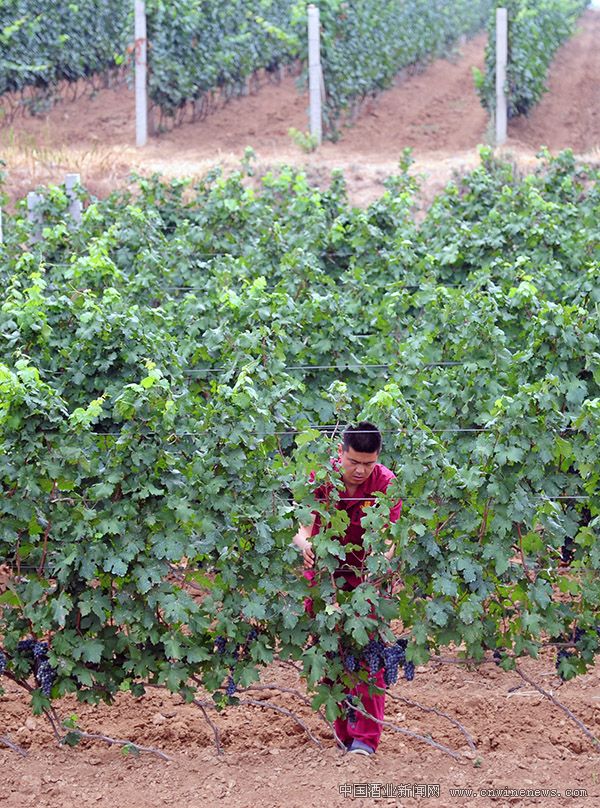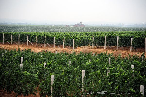 圖1:張?jiān)V鞓蚱咸鸦匚挥谌R州市朱橋鎮(zhèn)東南部,站在基地的高處環(huán)顧四周,目光所及是8000畝連綿不絕的葡萄綠海縱橫交錯(cuò),這里之前是一片荒山,張?jiān)9緩漠?dāng)?shù)剞r(nóng)民手里進(jìn)行土地流轉(zhuǎn)后,經(jīng)平整,種上了適應(yīng)貧瘠土地的釀酒葡萄,變廢為寶。這里位于北緯37.5度附近,與法國(guó)著名葡萄酒產(chǎn)區(qū)波爾多地區(qū)處于同一緯度,自然條件十分適合種植優(yōu)質(zhì)釀酒葡萄,已經(jīng)成為國(guó)內(nèi)單體連片面積最大的自營(yíng)釀酒葡萄種植園。