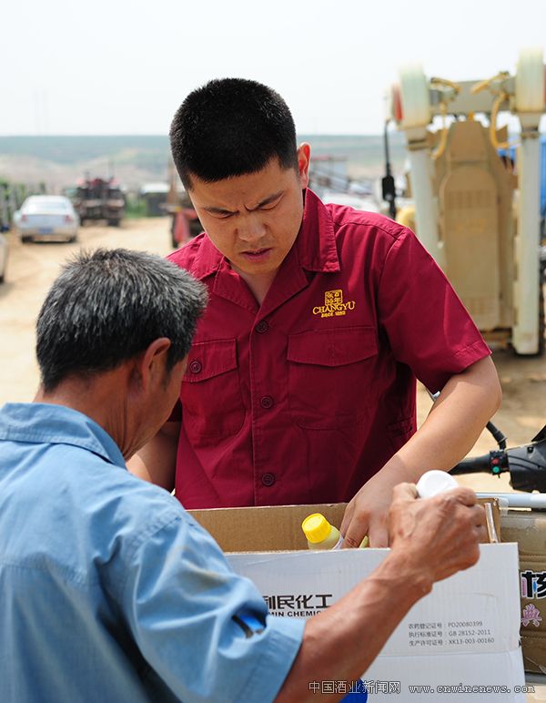 圖7:早上6:40,楊亞超為合作農(nóng)戶講解進(jìn)口生物制劑的用法。張?jiān)9咎峁┑霓r(nóng)資都是有機(jī)生物制劑,能自動(dòng)降解,保證張?jiān).a(chǎn)品質(zhì)量安全。
