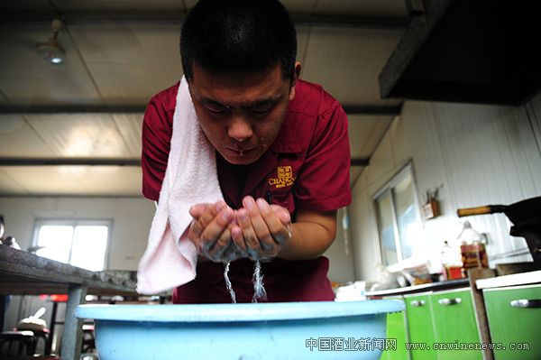 圖20:在簡(jiǎn)陋的活動(dòng)板房吃晚飯,飯前他要總結(jié)葡萄園一天的工作,匯總其他技術(shù)員發(fā)現(xiàn)的問題,制定解決措施,安排第二天的工作。