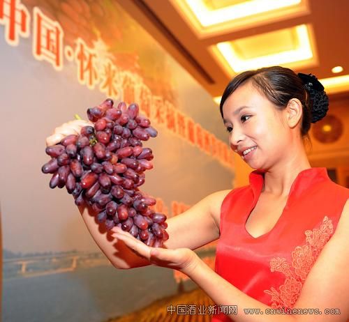懷來縣所處的北緯40度線是文章來源華夏酒報世界葡萄種植的黃金地帶。當地葡萄栽培已有上千年歷史,目前該縣葡萄種植面積達到22萬畝,葡萄酒生產企業達27家,形成8大品牌、50多個品種的葡萄酒產品。圖為開幕式上的一名工作人員展示“美人指”葡萄。