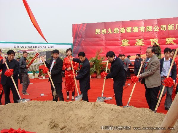 10月25日,民權九鼎葡萄酒有限公司新廠工程奠基儀式在河南省民權縣南華產業集聚區舉行,這一項目的開工,標志著在不久的未來,河南省第一座集生產、研發、會議接待、業務培訓、葡萄酒博物館、葡萄采摘、葡萄和葡萄酒品嘗、地下酒窖參觀及娛樂休閑為一體的生態旅游酒莊將在民權誕生。