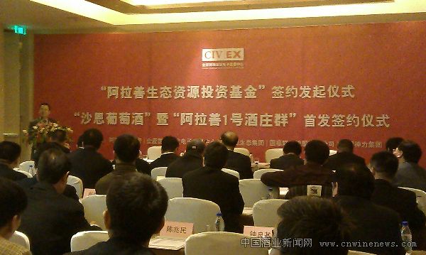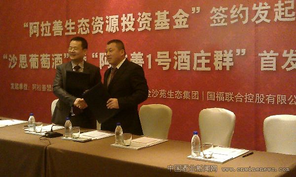 1月12日,由中國國際酒飲電子交易中心、內蒙古阿拉善盟、金沙生態集團、國福聯合控股有限公司等共同發起的“阿拉善生態資源投資基金”簽約儀式暨“沙恩葡萄酒、阿拉善一號酒莊群”首發簽約儀式在上海舉行。