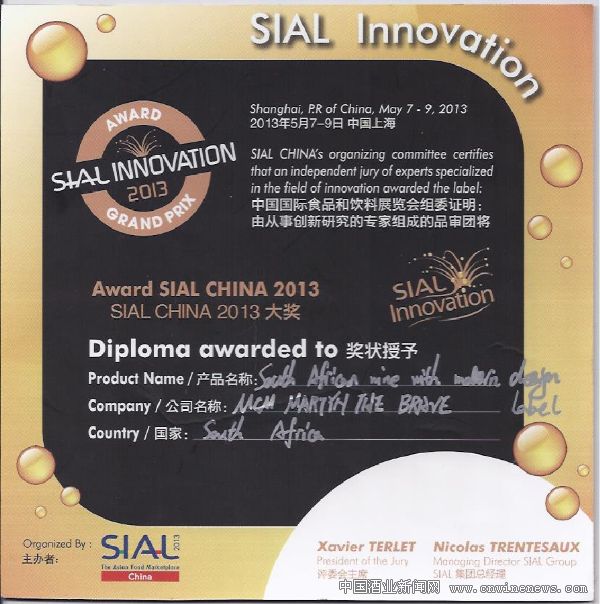 日前,在SIAL 2013中國國際文章來源中國酒業新聞網食品和飲料博覽會上舉辦的食品趨勢及創新大賽上,來自南非的MCM葡萄酒公司獲專家品審團頒發的創新產品獎,此外還獲得組委會評出的“特別獎”,這也是南非葡萄酒首次獲得此項殊榮。