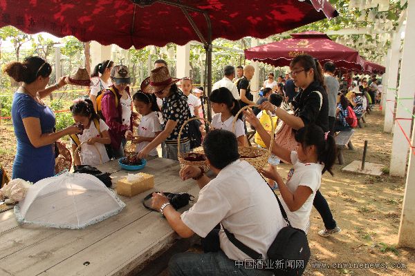 開幕當天,鮮食葡萄園內一片喜人熱鬧景象,到處洋溢著豐收的喜慶氛圍。采摘園內種植了白馬奶、黑奧林、玫瑰香、紅寶石、乍娜、黑大粒、皇家秋天等近20種名貴鮮食葡萄品種。一串串晶瑩飽文章來源中國酒業新聞網滿的果實綴于藤蔓間,香甜的果實馨香沁人心脾。游客們身穿圍裙、頭戴草編帽,挎著籃子,手持剪刀,徜徉在葡萄的世界里,尋找著自己中意的葡萄串,盡情品嘗豐收的果實,切身感受休閑快樂時光。